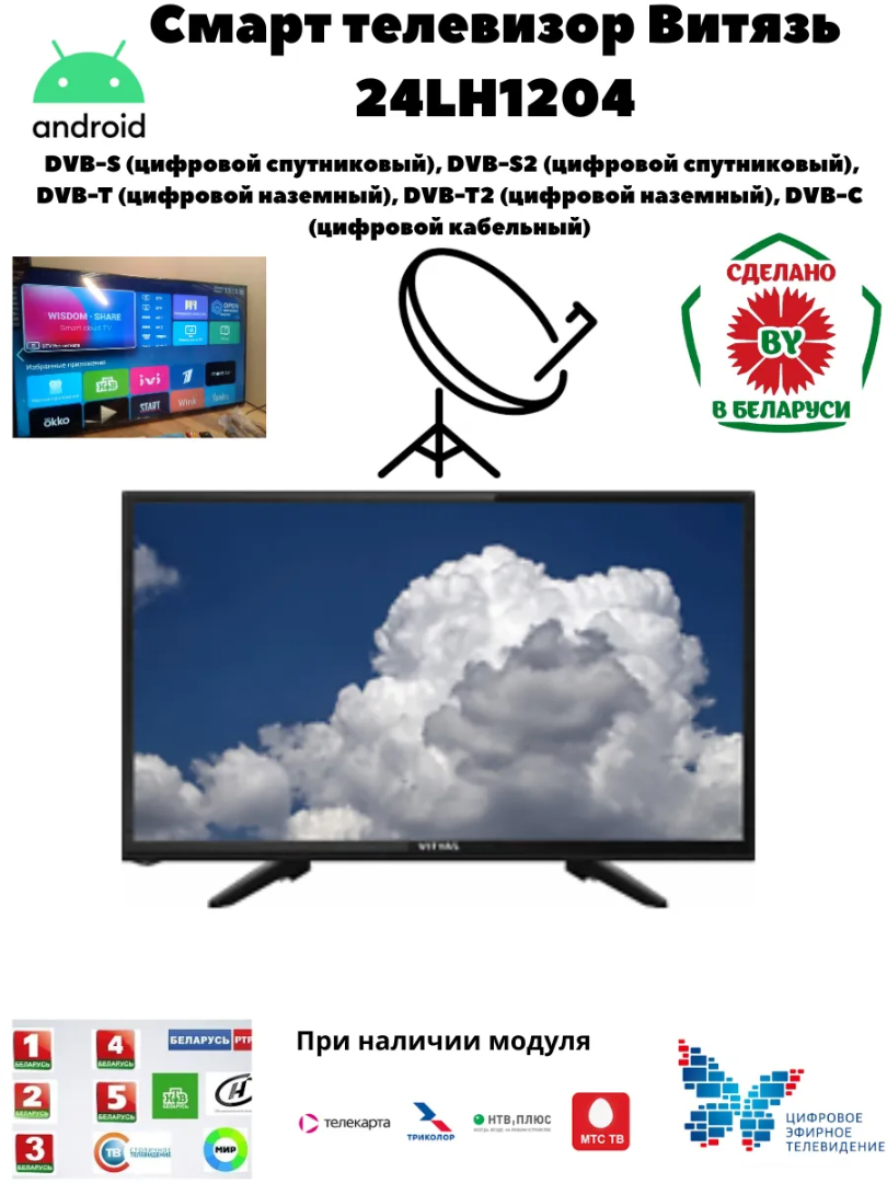 Новинка 2025 года: Телевизор Витязь 24 дюйма с Smart TV на Android 14Представляем вашему вниманию эксклюзивную модель 2025 года от белорусского бренда "Витязь" — компактный 24-дюймовый телевизор, сочетающий стильный безрамочный дизайн и передовые технологии Smart TV. Этот телевизор станет идеальным решением для кухни, спальни, детской комнаты или дачи.