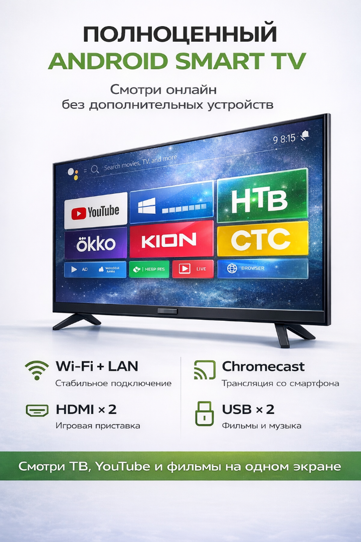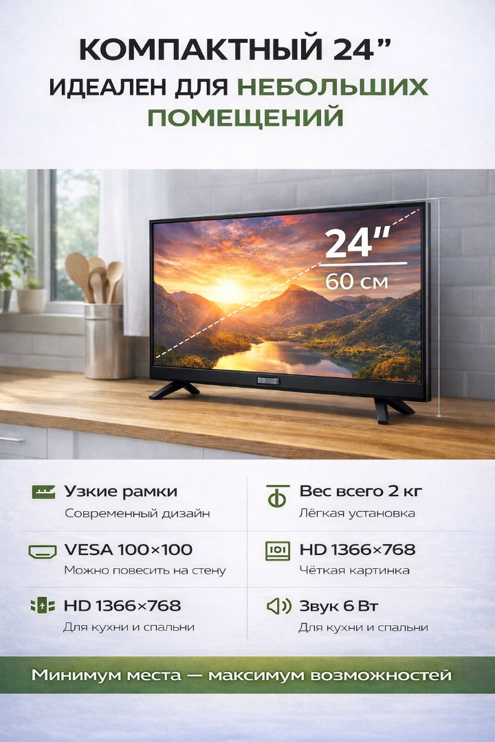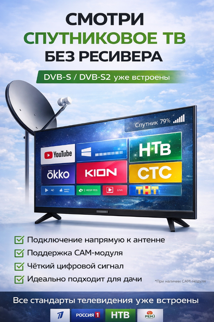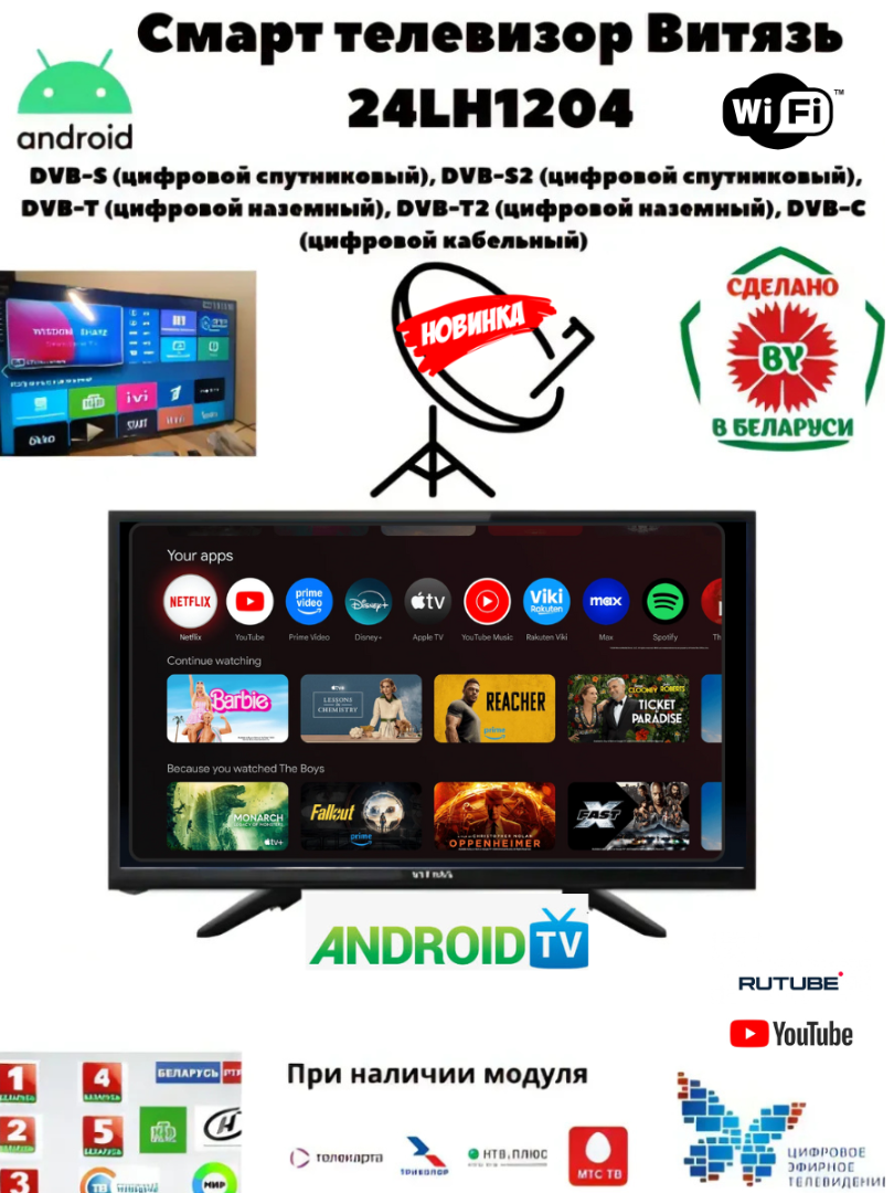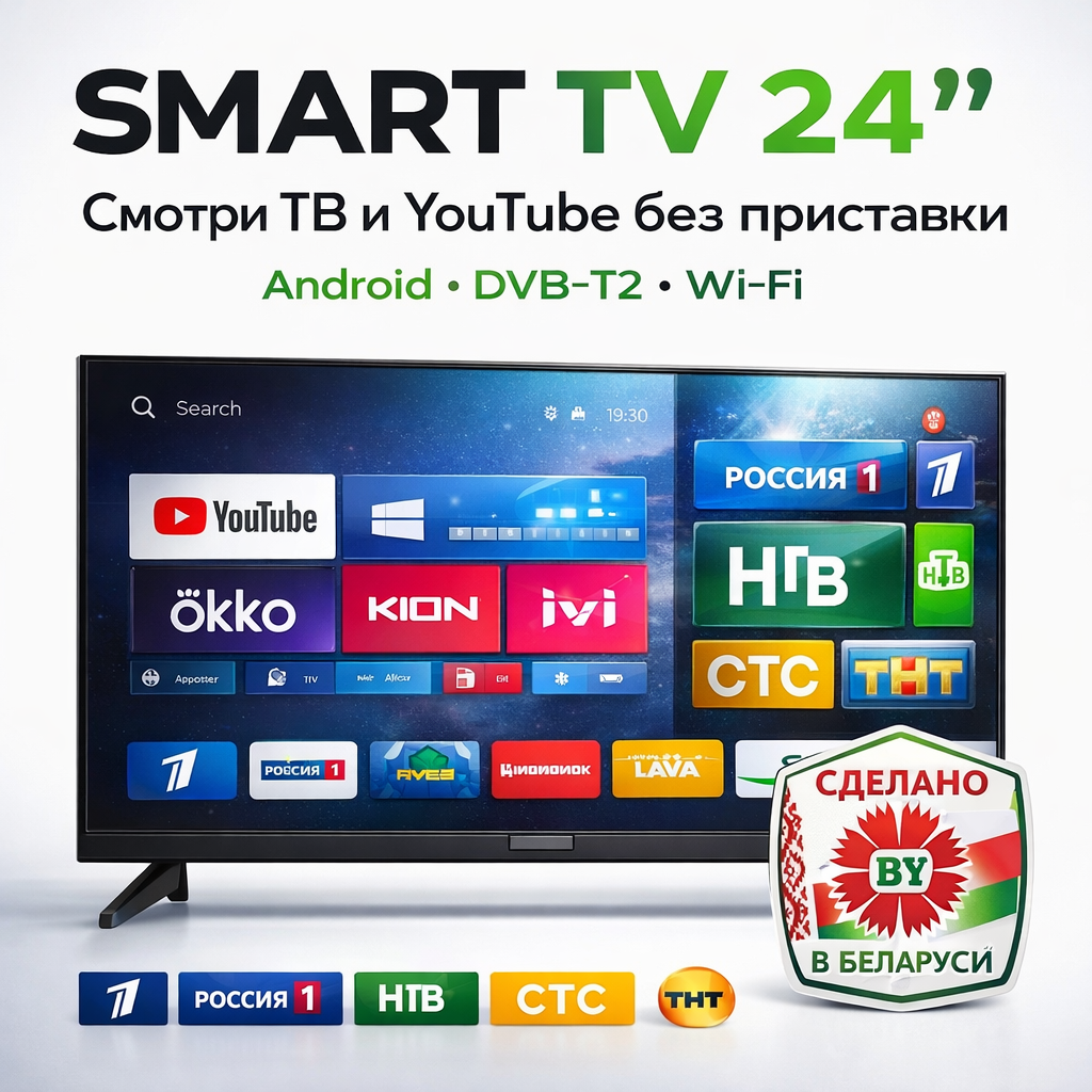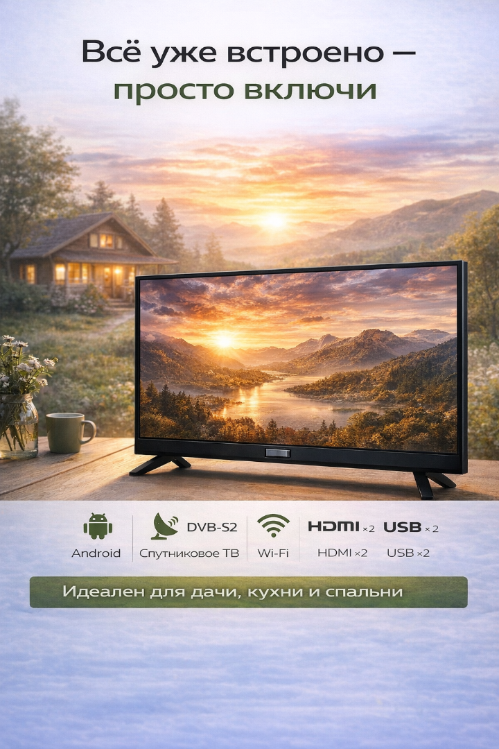 Инновационный 24-дюймовый телевизор „Витязь“ (2025) на базе Android 14. Безрамочный экран, мощный процессор CA55 и полноценный Smart TV с поддержкой Wi-Fi. Компактный формат с возможностями флагманских моделей для современного дома