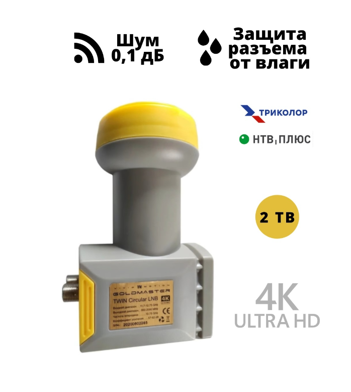 Улучшенный Twin конвертор для приема круговой поляризации верхнего Ku диапазона с двумя независимыми выходами. Обладает низким уровнем собственного шума. Применяется для приема вещания со спутников в позициях 36E, 56E и 140E. Имеет влагозащищенный корпус.