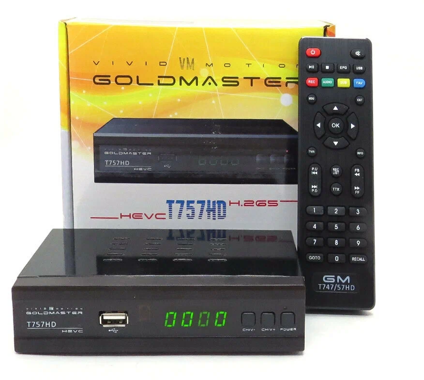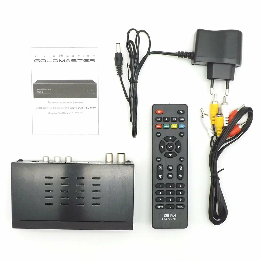Компактная комбинированная приставка Goldmaster T757HD исполнена в металлическом корпусе, что предотвращает от перегреваний. Тюнер предназначен для приема цифрового эфирного DVB-T2, кабельного DVB-C и IPTV вещания. Приёмник поддерживает новый формат сжатия видео H.265 (HEVC).