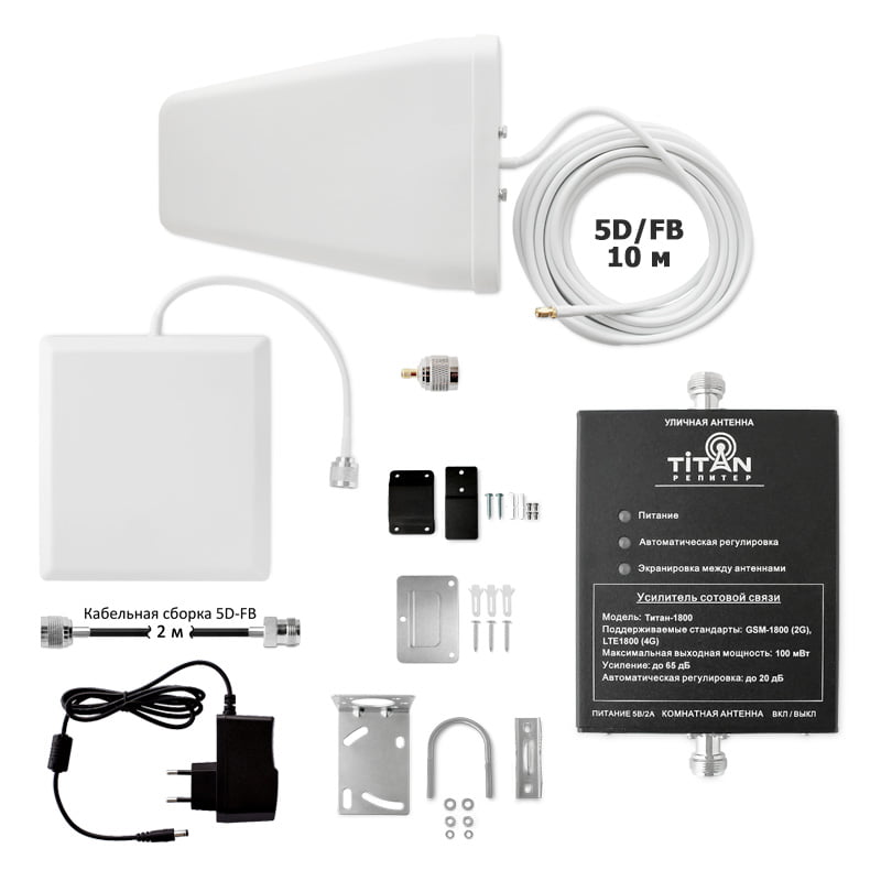 Усилитель сотовой связи GSM-1800 и мобильного 4G-интернета LTE-1800 от производителя Vegatel. Комплект основан на репитере Titan-1800 (версия с LED-индикацией) и содержит все необходимые устройства, чтобы быстро установить оборудование в квартире, на даче или в коммерческом помещении. Комплект рассчитан на помещения площадью 100–200 м2.