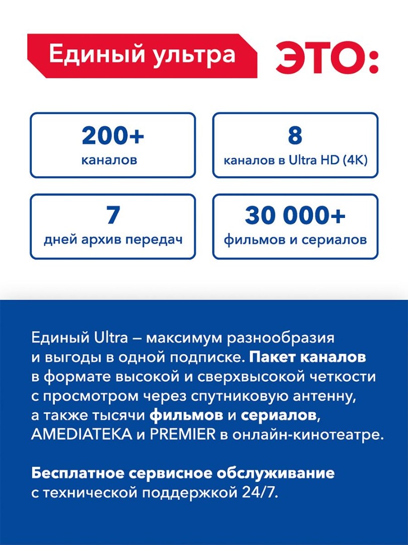 Подписка «Единый Ultra» — это: 200+ каналов, в том числе 8 каналов в формате UHD и эксклюзивные каналы собственного производства; спортивные трансляции, концерты и спектакли, прямые эфиры, уникальные проекты, эксклюзивные шоу и мастер-классы; тысячи фильмов и сериалов в онлайн-кинотеатре «Триколор Кино и ТВ»; контент от AMEDIATEKA, PREMIER, каналов START Air и START World; управление эфиром: перемотка, пауза и архив передач за 7 дней; подключение до 5 устройств к одному профилю: есть приложение для смартфонов, планшетов и телевизоров, а также версия в браузере.