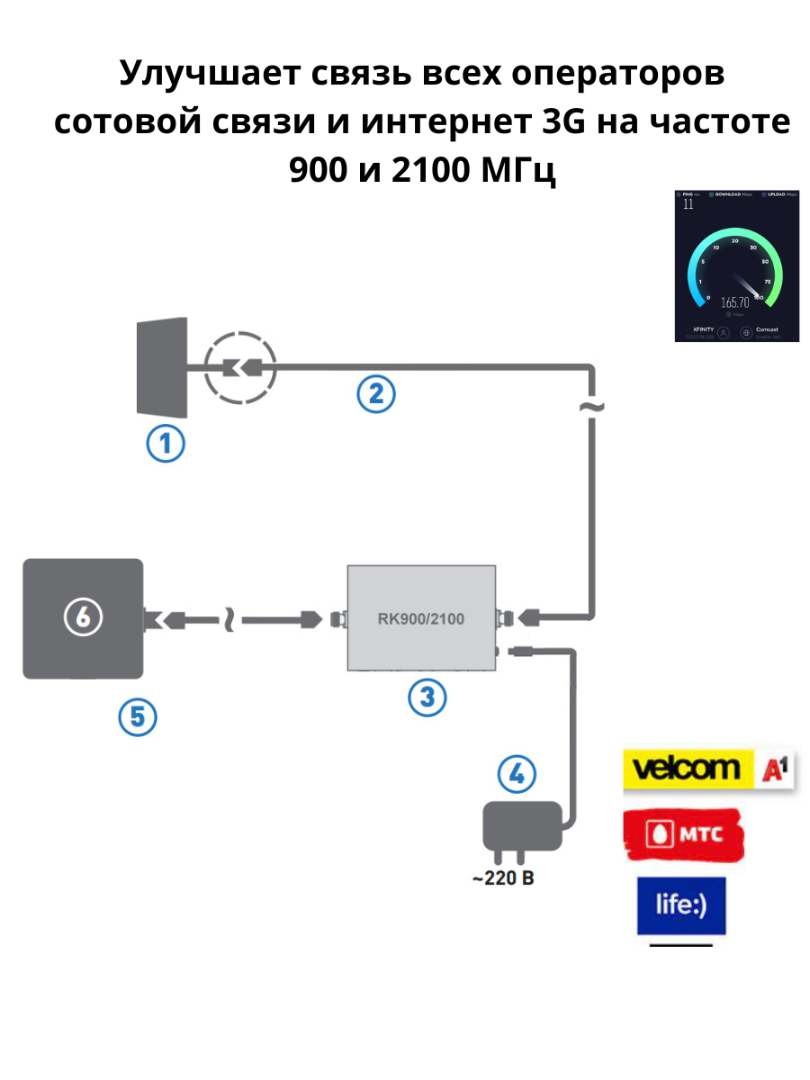 Данный комплект рекомендуется использовать в помещениях объектов, где сигнал плохой или отсутствует, а на улице приемлемый или хороший. Улучшает прием сотовой связи МТС, A1, Life.
