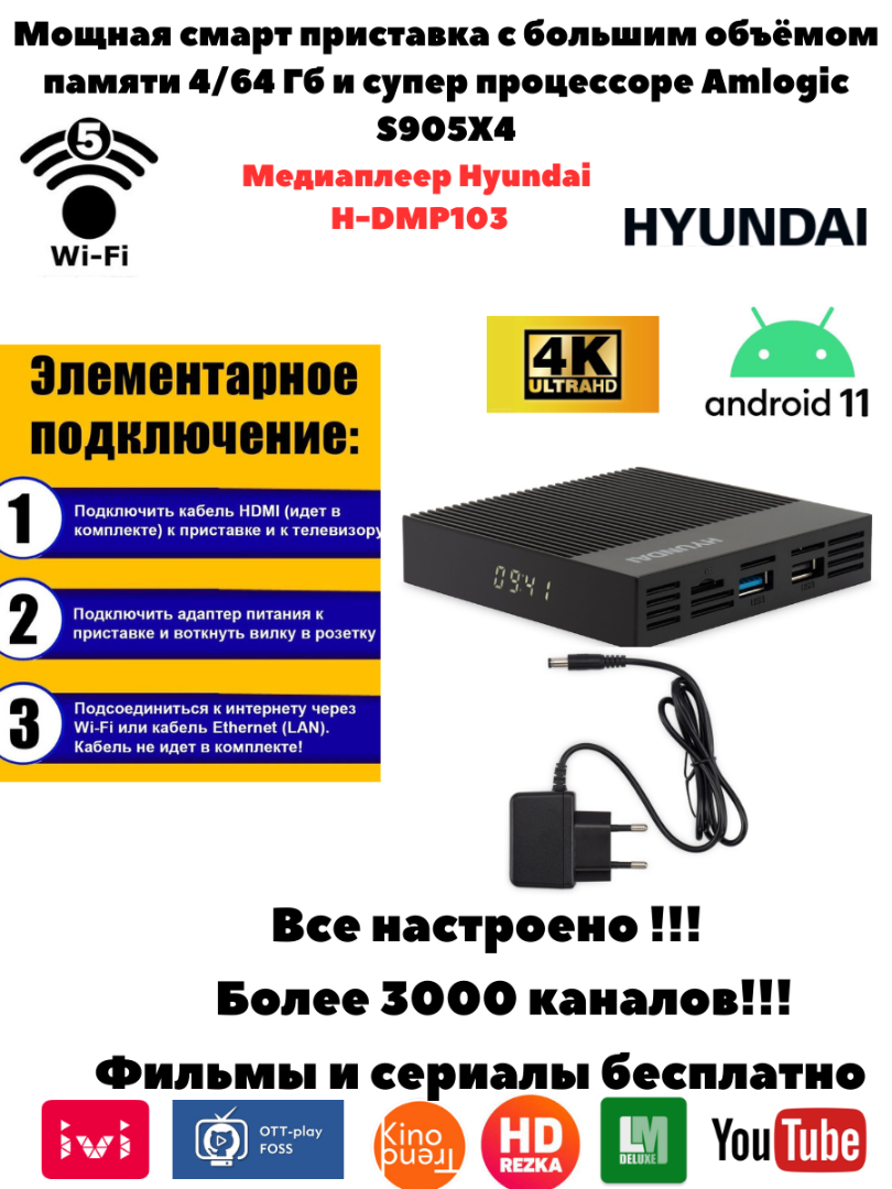 Hyundai H-DMP103 готова к работе сразу после подключения. Нет необходимости в дополнительных настройках. Просто подсоедините HDMI-кабель, подключите интернет (Wi-Fi или кабель) и начните наслаждаться просмотром.