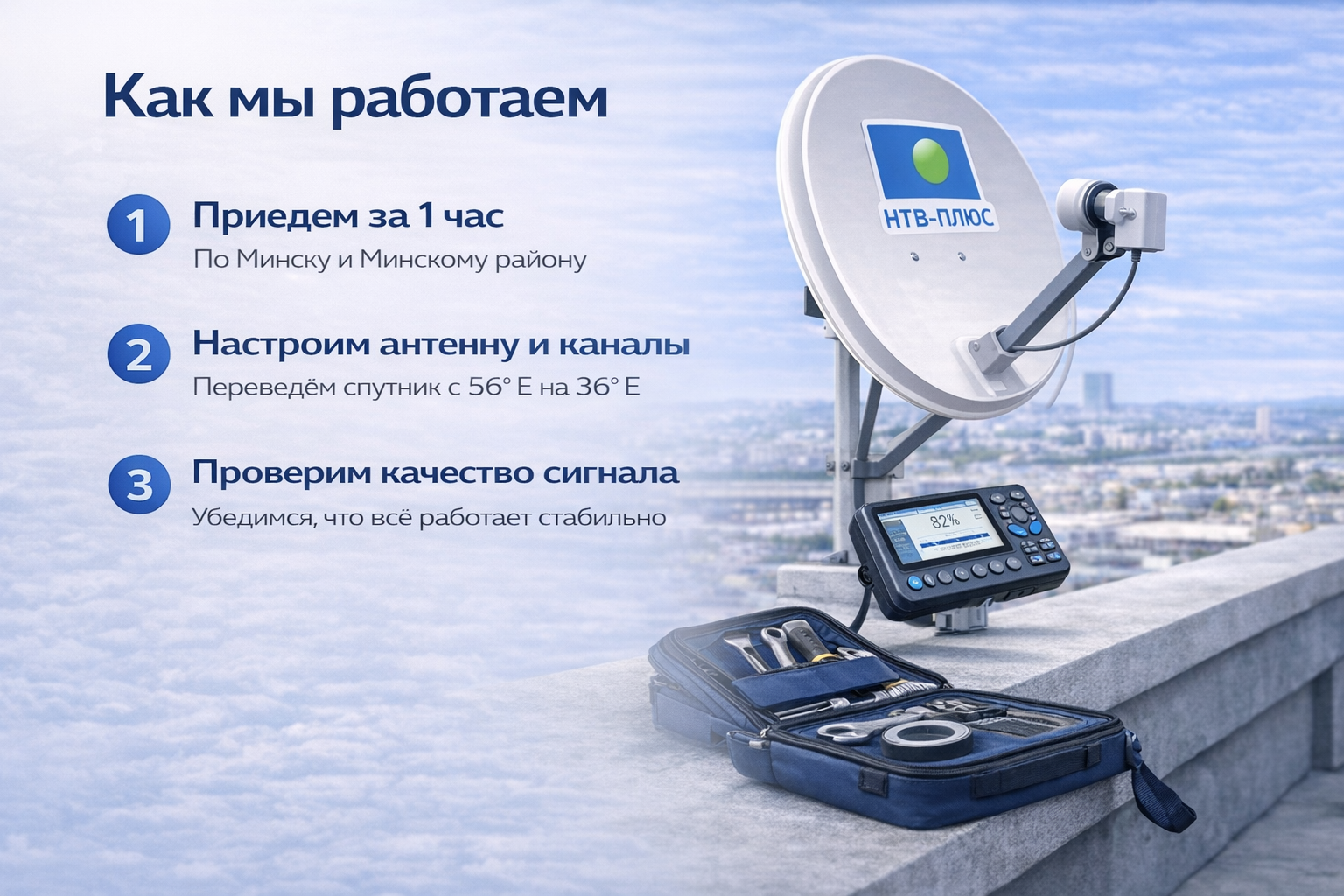 Преимущества услуги: — настройка антенны на 36 градус без покупки нового оборудования — быстрый выезд мастера по Минску и области — опыт работы со спутниковым ТВ НТВ-Плюс и Триколор — гарантия на выполненные работы