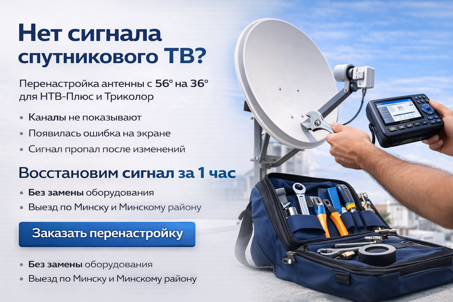 В связи с техническими изменениями в вещании спутниковых операторов НТВ-Плюс и Триколор ТВ на 56 градусе (спутник Экспресс-АТ1), многие абоненты в Беларуси столкнулись с отсутствием сигнала или исчезновением каналов. Единственным стабильным решением для качественного приема в нашем регионе является переход на 36 градус (спутник Eutelsat 36B/36C).Оказываем услуги по настройке НТВ-Плюс и Триколор ТВ в Минске и Минском районе с выездом мастера на дом. Выполняем перевод антенны с 56 градуса на 36 градус быстро и без замены оборудования в большинстве случаев.