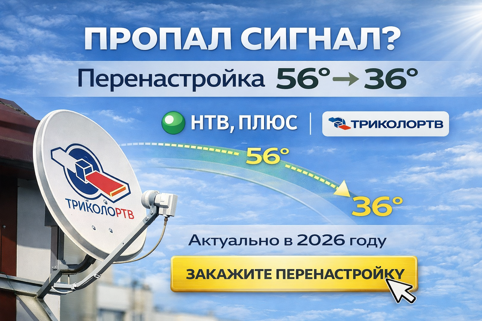 Актуально в 2026 году: массовый переход спутникового вещания с 56° на 36°. Если у вас пропал сигнал, не показывают каналы или появились ошибки — требуется перенастройка спутниковой антенны.