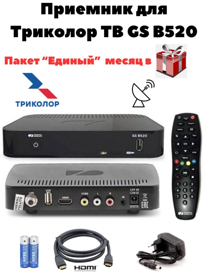 Приставка GS B520 создана специально на устройства с поддержкой HDTV по льготной цене. Высокая скорость работы; Удобный и адаптируемый под пользователя графический интерфейс; Воспроизведение медиаконтента с внешних носителей; Набор встроенных приложений: Кинозалы «Триколор ТВ», «Телегид», «Напоминания», «Игры» и др.; Полный спектр необходимых сервисов цифрового ТВ (субтитры, телетекст, EPG и пр.) Возможность установки дополнительных приложений, расширяющих функциональность; Прием телеканалов высокой четкости (до 1080p) и стандартного разрешения в форматах MPEG-4 AVC/ H.264 и MPEG-2; Трансляции контента оператора «Триколор ТВ» на IP-устройства, включая смартфоны и планшеты. GS B520 поддерживает просмотр трансляции с экрана телевизора и «зеркальный» стриминг – дублирование видеоконтента на мобильные устройства для реализации концепции TV to Go («возьми ТВ с собой»). Сервис доступен с планшетов и смартфонов на базе iOS или Android через приложение «Play.Триколор». Для стриминга видеоконтента требуется подключение ТВ-приставки к Wi-Fi-роутеру в домашней сети.