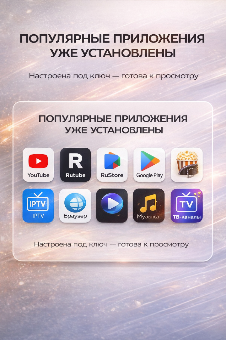 Доступ к тысячам фильмов и сериалов: Предустановлены все популярные стриминговые сервисы: Netflix, YouTube, IVI, Okko, Kinopoisk, YouTube Premium, Амедиатека и многие другие. Контент на любой вкус всегда под рукой.