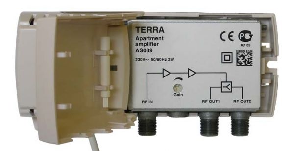 Телевизионный усилитель сигнала Terra AS 039 изготовлен в ударопрочном пластиковом кожухе, шасси размещается в металлическом модуле из цинкового сплава, который выступает в роли экрана от воздействия внешних помех. Усилитель устанавливается в непосредственной близости от эфирной антенны или на ввод коаксиального кабеля в квартиру. Запитывается от сети переменного напряжения 230 Вольт, для этого предусмотрен сетевой шнур питания. Для индикации рабочего режима на верхней части корпуса присутствует светодиод зеленого свечения. Для упрощения настройки усилителя в комплекте предоставляется специальная пластмассовая отвертка, спрятанная под крышкой на защелках, при помощи которой выполняется регулировка подстроечного резистора. Дополнительно для выполнения крепления к стене в комплект поставки входят два дюбеля.