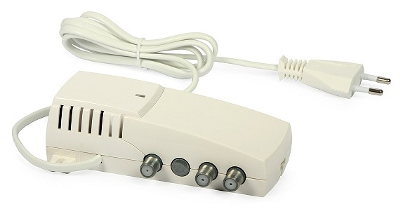 Телевизионный усилитель с регулировкой уровня выходного сигнала. Может использоваться для усиления цифрового эфирного и кабельного вещания в стандартах DVB-T2/C. Оснащен двумя выходами и встроенным блоком питания. Для подключения кабелей применяются F-разъемы.