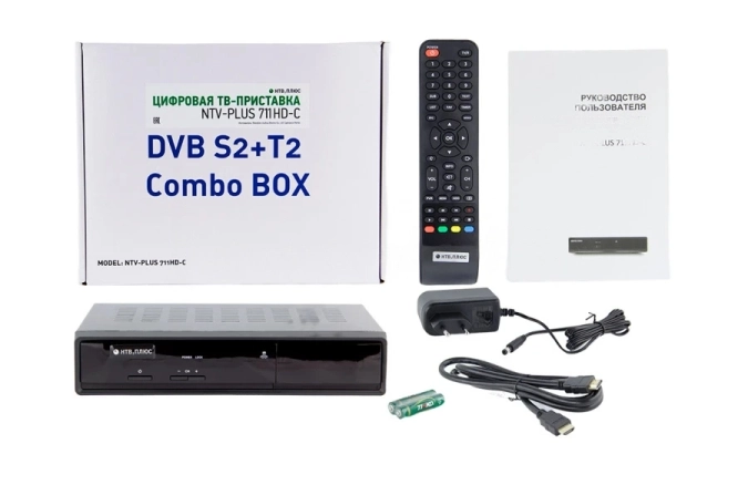 В комплект поставки входят: ТВ-приставка 711HD-C, внешний адаптер электропитания, пульт дистанционного управления (пульт ДУ), кабель HDMI и руководство пользователя (на русском языке).