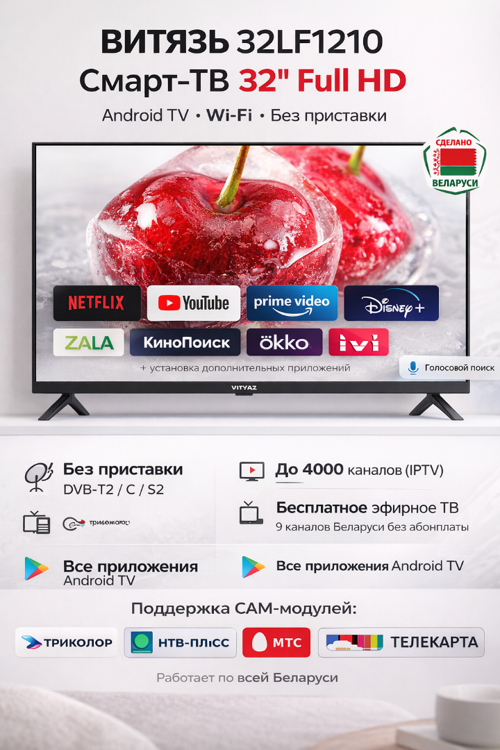 Мы предлагаем выгодные условия покупки белорусской техники с официальной гарантией. Вы можете заказать телевизор Витязь 32LF1224 с быстрой доставкой в Минск, Брест, Гродно, Гомель, Витебск, Могилев и любой другой населенный пункт Республики Беларусь.