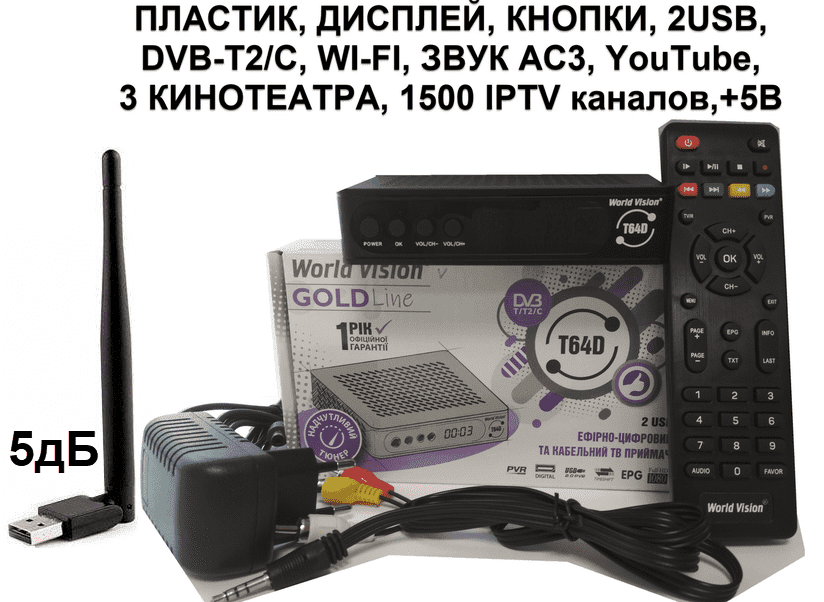 Новая комбинированная телеприставка World Vision T64D на высокопроизводительном процессоре Availink 1506T (Sunplus) для приема цифрового ТВ в стандартах эфирного DVB-T/T2 и кабельного DVB-C телевидения. На лицевой панели присутствует светодиодный дисплей отображающий номер канала и часы. Модель World Vision T64D обладает всеми необходимыми функциями для приема и просмотра цифровых эфирных и кабельных каналов телевидения, поддерживается функция EPG для просмотра расписания передач на несколько дней вперёд и установка таймера на включение и запись, а функция отложенного просмотра позволяет поставить живой телеэфир на паузу и вернуться к просмотру позже. Быстродействующая программная оболочка имеет встроенный медиацентр который позволит вам просматривать фильмы (поддержка аудио кодека AC3), фото, файлы записанного эфира, а также слушать музыку. Присутствует возможность подключения телеприставки к проводной и беспроводной интернет сети при помощи USB адаптеров LAN и Wi-Fi, что предоставит пользователю возможность доступа к приложениям Megogo, IVI RU, а также использовать встроенный локальный и облачный IPTV плеер с поддержкой плейлистов m3u. Телеприставка имеет функцию стартовой загрузки в список IPTV каналов, режим может быть изменён в системных настройках. Простота настройки и использования, отличное качество изображения высокой четкости и звука, навигатор по программе передач, списки избранных каналов, поддержка телетекста и субтитров, делают World Vision T64D превосходным выбором.